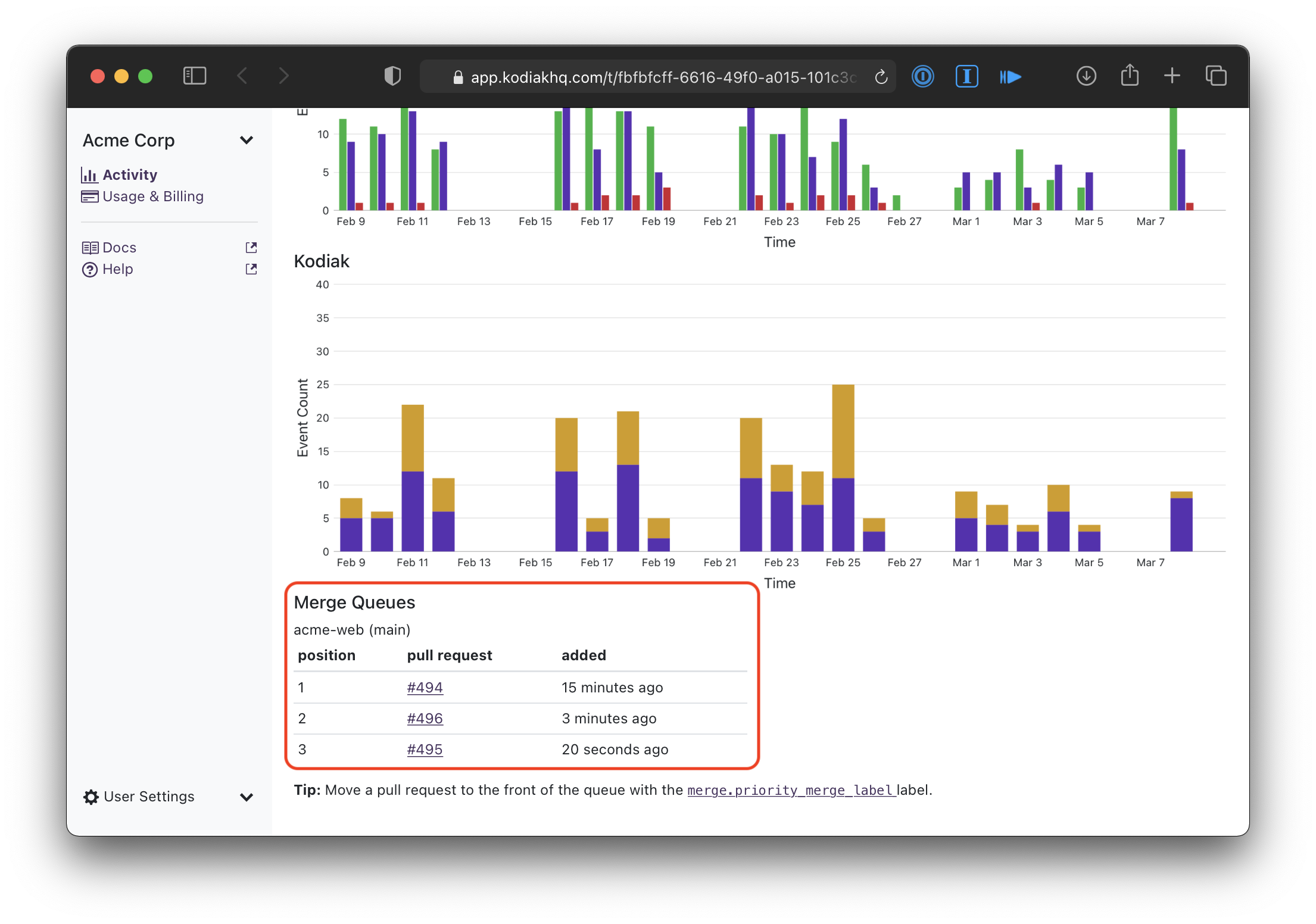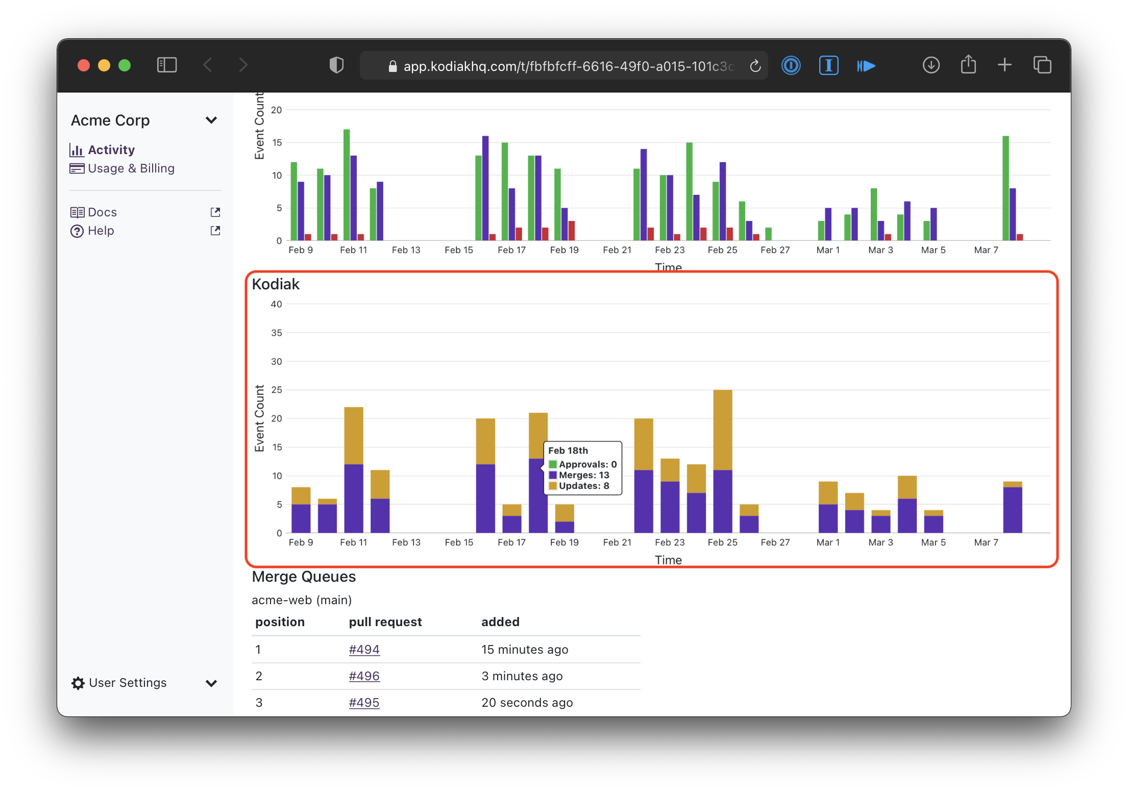 The activity page is the main landing page for the Kodiak dashboard. It shows activity charts and merge queue information.