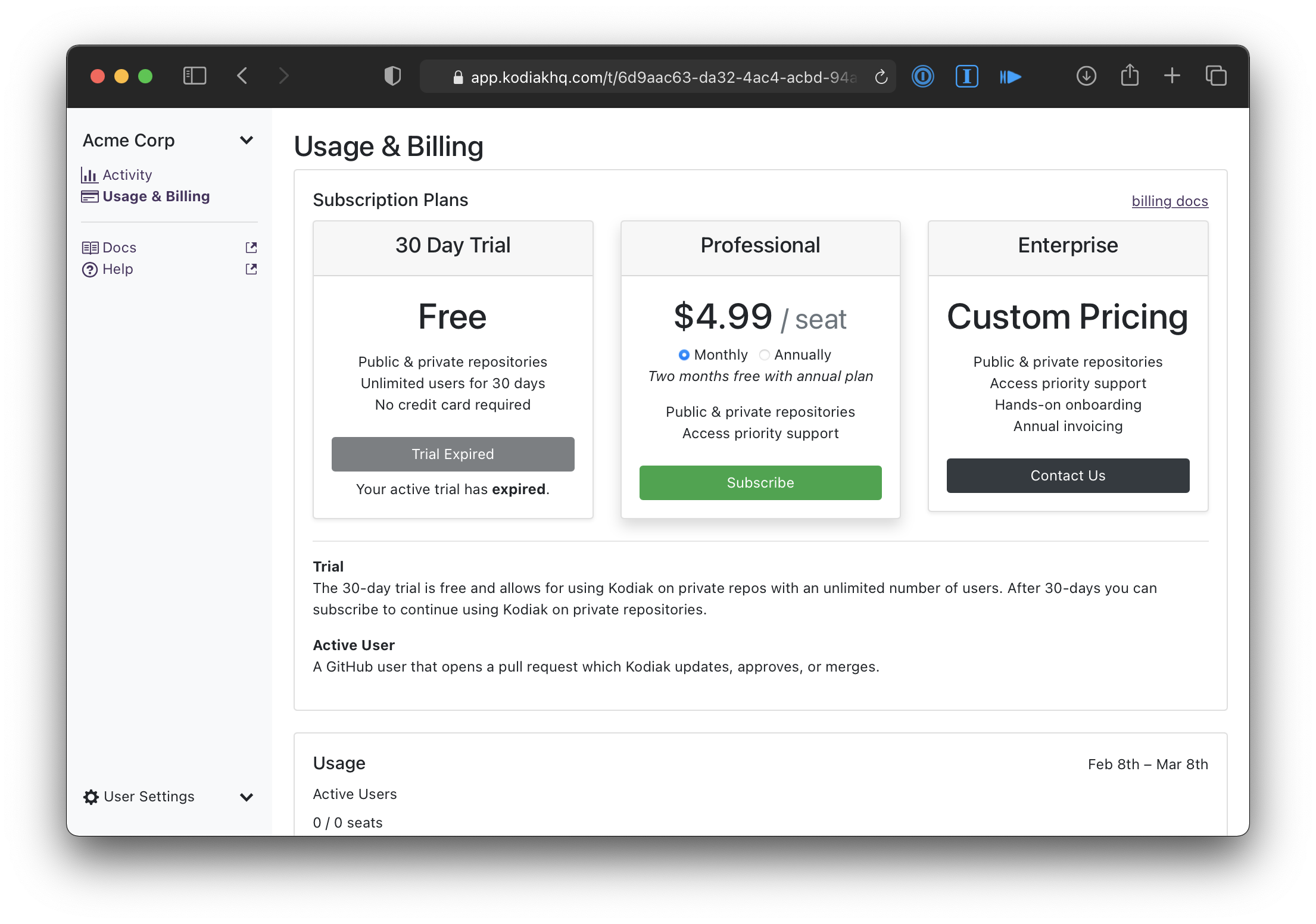 The usage and billing page displays trial and subscription information. You can start a trial or subscription via this page, update billing details and view subscription usage information.