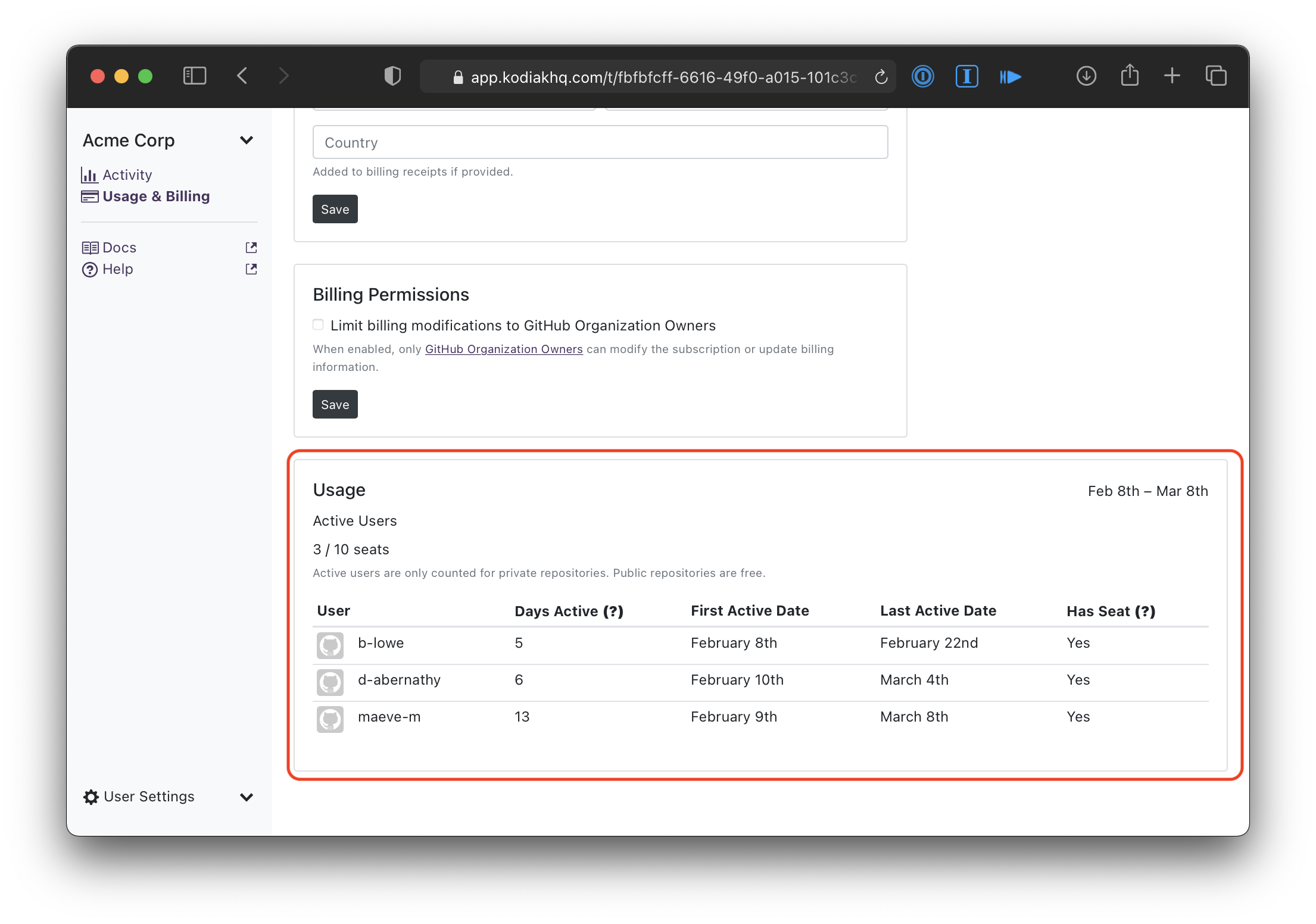 Seat license usage information is available at the bottom of the "Usage & Billing" page.